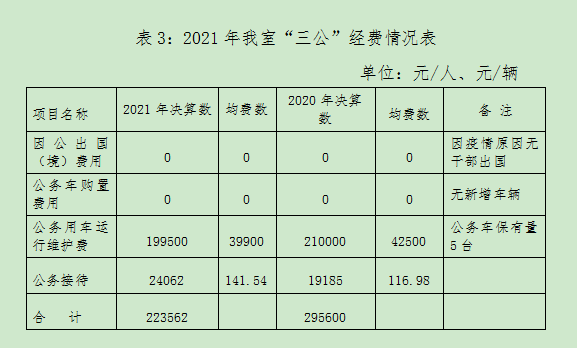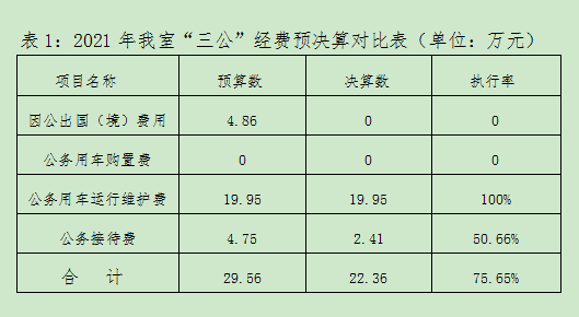 从预决算对比分析,2021年,我室“三公”经费决算数22.36万元,较年初预算数29.56万元减少7.20万元,减幅24.36%。其中,因公出国(境)费用决算数0万元,较年初预算数4.86万元减少-4.86万元,减幅100%;公务用车购置费用决算数0万元,与年初预算数0万元一致;公务用车运行维护费决算数19.95万元,与年初预算数19.95万元一致;公务接待费决算数2.41万元,较年初预算数4.75万减少2.34万元,减幅97.10%。“三公”经费整体和分项均控制在年初预算数以内,取消因公出国(境)工作任务、严格公务车管理、严格控制公务接待。(见表1)