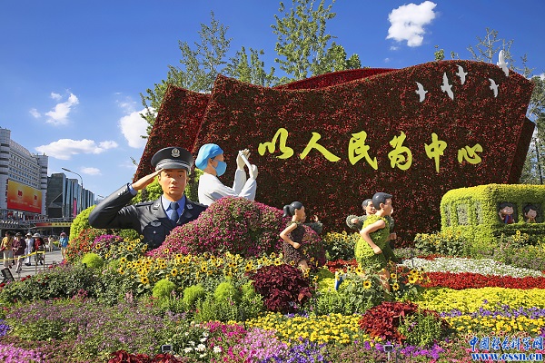 北京:庆祝建党百年主题立体花坛亮相长安街 图为位于西单路口的“人民至上”主题花坛。图片来源:视觉中国