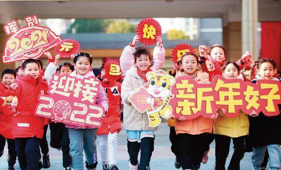2021年12月30日,江苏省扬州市梅岭小学西区校杨柳青校区的学生喜迎新年 孟德龙摄/本刊