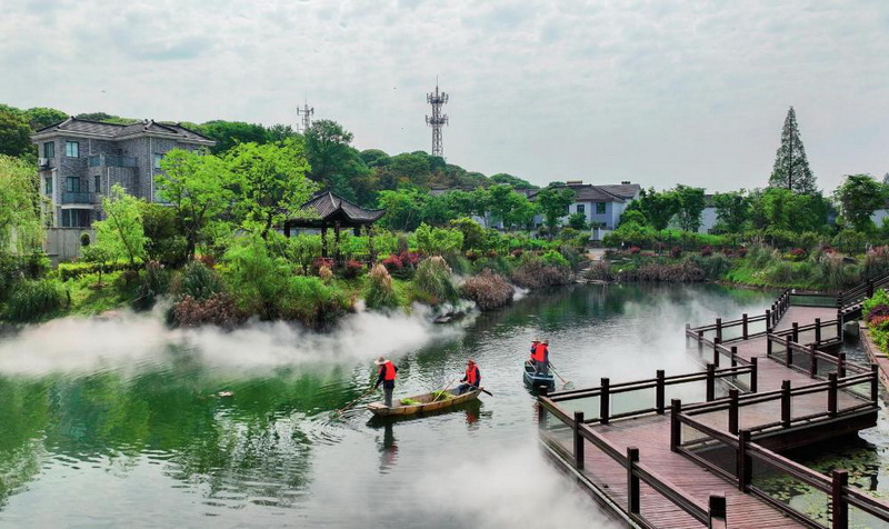 在浙江省湖州市德清县洛舍镇东衡村,河道保洁员在进行日常保洁(2022年4月12日摄) 王正摄
