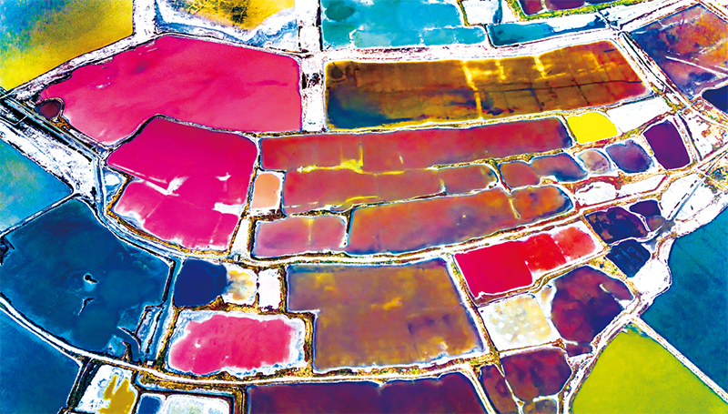 中国式现代化是人与自然和谐共生的现代化。党的十八大以来,我国坚持可持续发展,坚定不移走生产发展、生活富裕、生态良好的文明发展道路。图为2022年10月29日,在山西省运城市盐湖景区拍摄的色彩斑斓的盐湖美景。 人民图片 薛俊/摄