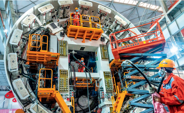 工人在中铁装备集团车间内进行掘进机主机拆机作业,以便出口运输(2022年11月23日摄)摄影/本刊