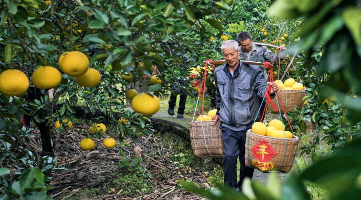 重庆市梁平区合兴镇龙滩村村民挑运采摘的柚子(2022年11月9日摄)王全超摄/本刊
