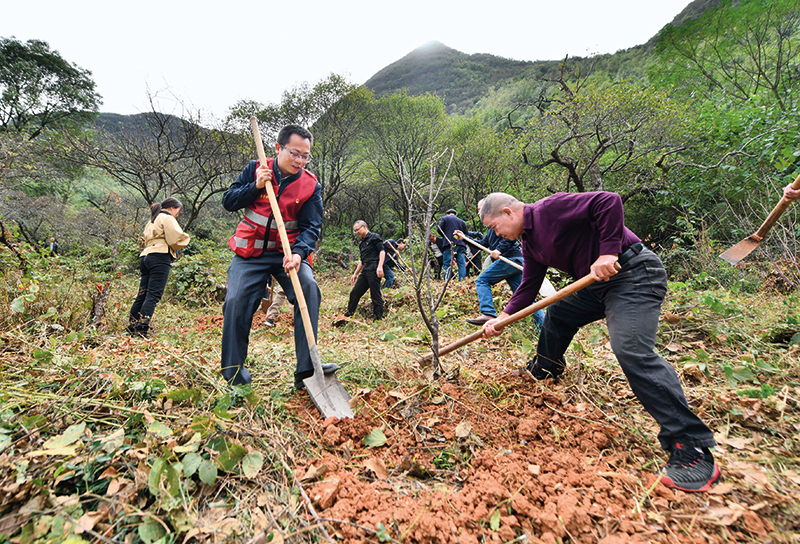 在广西柳州市融安县东起乡铜板屯,柳州市林业和园林局党员干部和驻村第一书记在种植李树苗(2022年10月10日摄)黄孝邦摄
