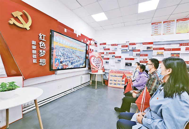 2022年10月16日,北京市东城区建国门街道赵家楼社区党员代表在社区“红色梦想”党建活动室,收看党的二十大开幕会直播。 北京市东城区建国门街道供图 邓伟/摄