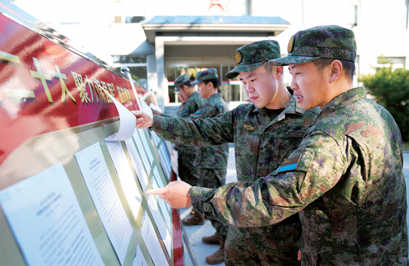 党的二十大胜利召开后,在大江南北的座座军营,在野外驻训地,在边关哨所,在任务点位,全军各部队通过举行多种活动,学习宣传贯彻党的二十大精神。图为空军某后勤训练基地学习党的二十大精神征文展评活动现场。 申卫红/摄