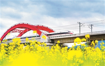 我国现代化是人与自然和谐共生的现代化。图为2023年2月14日,一列高铁列车从赣深高铁龙南特大桥疾驰而过,沿线田野盛开的油菜花和绿色生态美景沁人心脾。(图片来源:视觉中国)