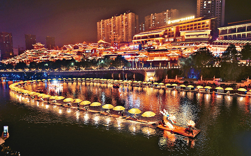 我国拥有14亿多人口、4亿多中等收入群体,是全球超大规模且最有增长潜力市场。2022年,社会消费品零售总额44万亿元。图为2023年1月28日,游客在湖北省恩施土家族苗族自治州宣恩县仙山贡水旅游区乘坐“贡水游龙”赏夜景。 新华社发 王俊/摄
