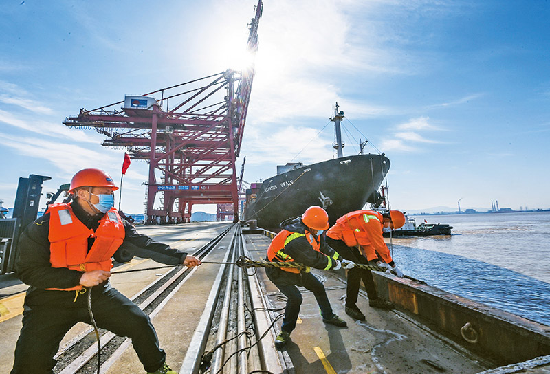 农历新年伊始,众多行业迅速投入生产,为经济运行持续攀升,实现开门稳、开门好、开门红、开门旺奠定坚实基础。图为2023年1月31日,在宁波舟山港金塘港区大浦口集装箱码头上,工作人员合力拉缆绳,帮助一艘外籍货轮靠泊。 新华社记者 徐昱/摄