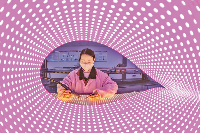 春节过后,各地企业开足马力赶制订单,满足国内外市场供应。图为2023年1月31日,江西省瑞昌市智造小镇一家企业LED低压灯带生产线前,工人正在对灯带进行测试。人民图片 魏东升/摄