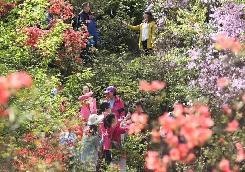 近日,湖北十堰茅箭南部山区茅塔乡东沟红色教育基地成片杜鹃盛开,姹紫嫣红、满眼春色,引来一批批游客,在感受红色情怀、追忆革命精神的同时,赏花游玩、放松身心。