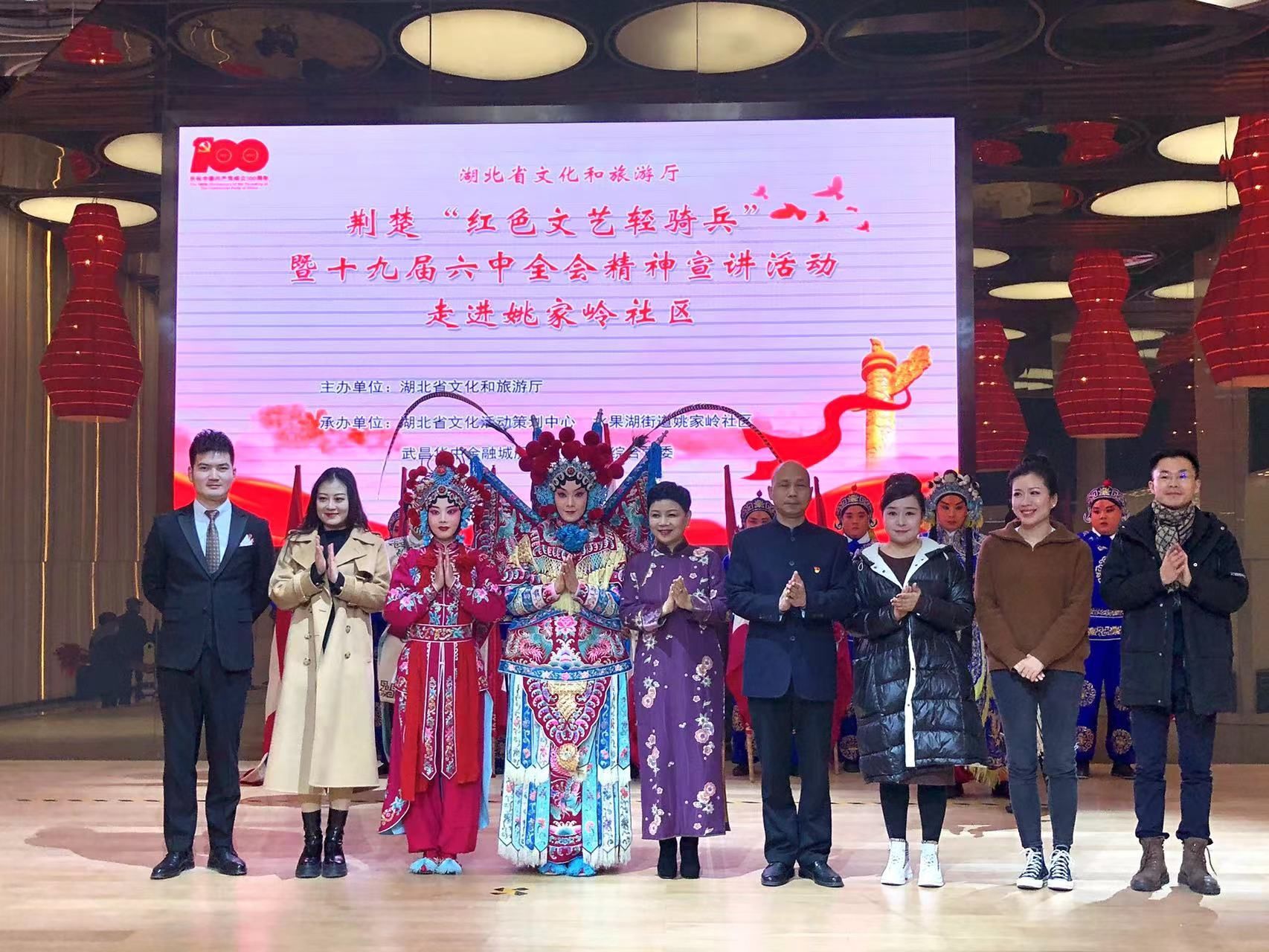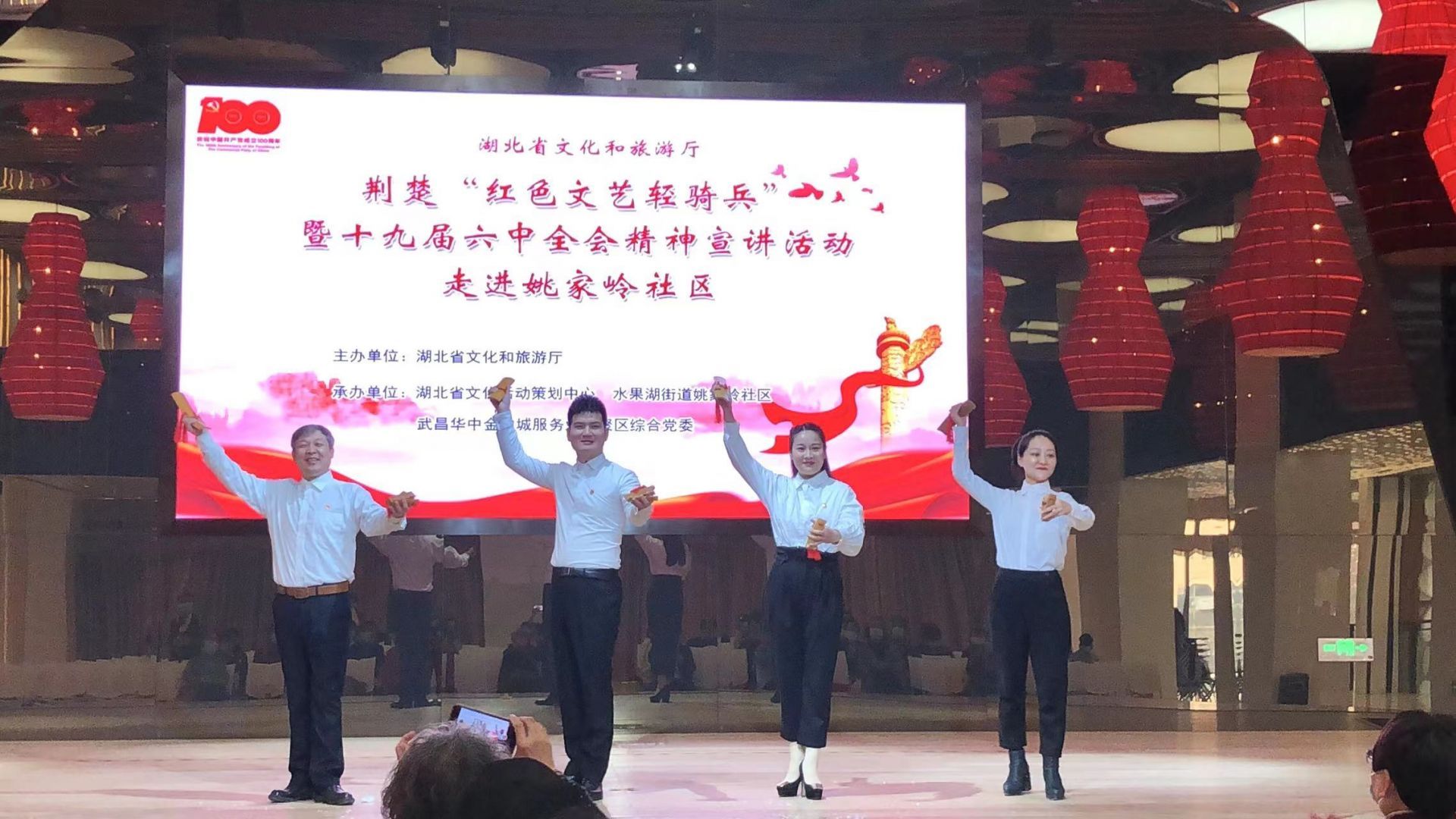 “红色文艺轻骑兵走基层,六中全会精神入民心。”近日,武汉市武昌区水果湖街道姚家岭社区邀请湖北省文化和旅游厅荆楚“红色文艺轻骑兵”六中全会精神宣讲小分队进社区,在长城汇楼宇带领社区党员、居民骨干、企业职工从党的十九届六中全会精神中汲取奋进力量。