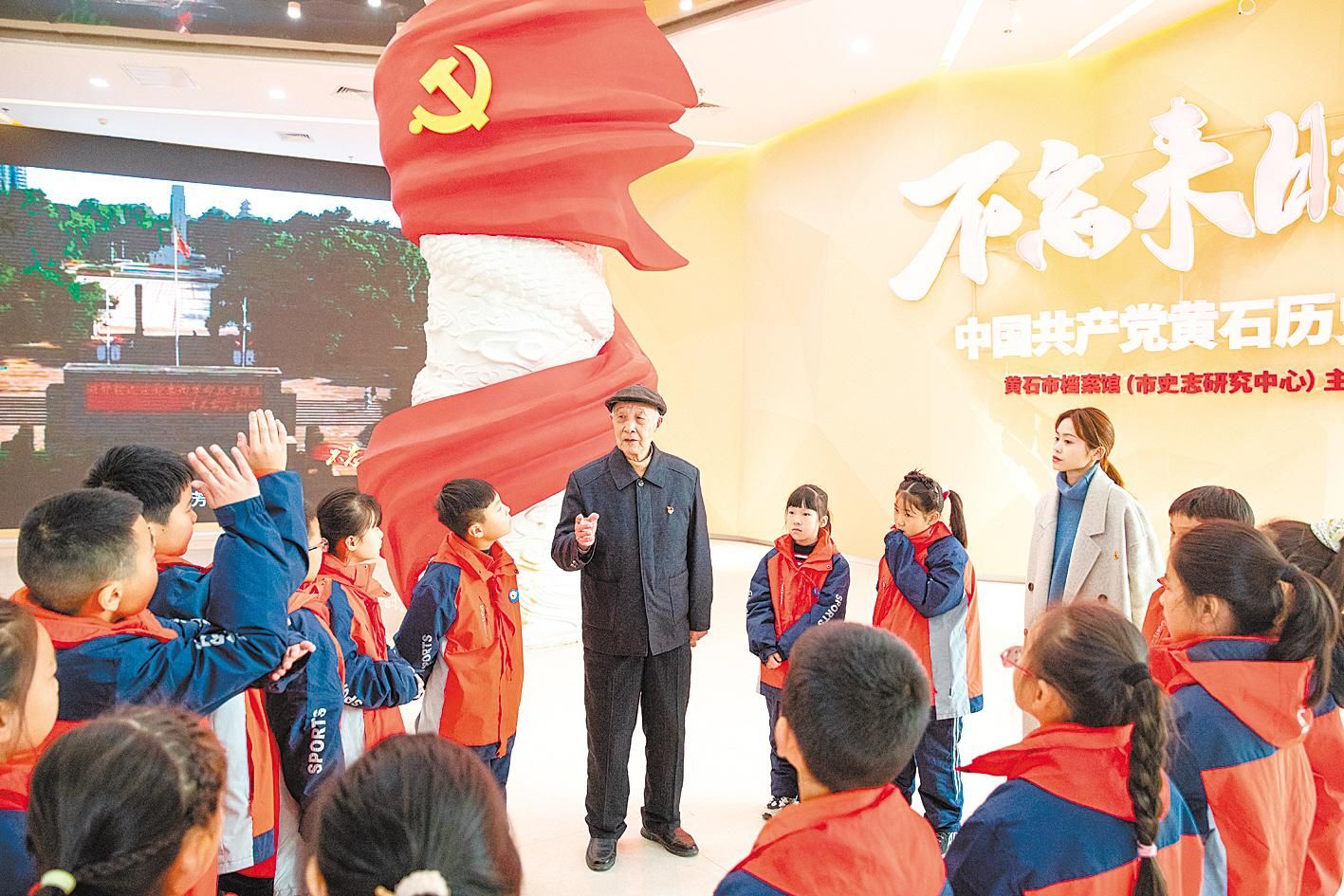 2021年12月22日,“全国基层理论宣讲先进个人”、“党史爷爷”王明林为黄石市沈家营小学师生讲党史课。 (湖北日报全媒记者 薛婷 通讯员 李征 摄)