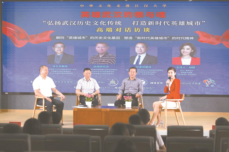 武汉是英雄之城。武汉市第十四次党代会绘就了“打造新时代英雄城市”的蓝图。为凝聚发展建设的智慧和力量,帮助大学生了解新时代英雄城市的历史文化底蕴和精神特质,近日,武汉市中华文化学院(武汉市社会主义学院)联合江汉大学举办高端对话会,邀请江汉大学涂文学教授、湖北省社科院张硕研究员、中南财经政法大学邓爱民教授,围绕“英雄武汉的根与魂——弘扬武汉历史文化传统 打造新时代英雄城市”主题,解码英雄武汉的历史文化基因,阐释新时代英雄城市精神品格,纵论武汉历史文化传承。