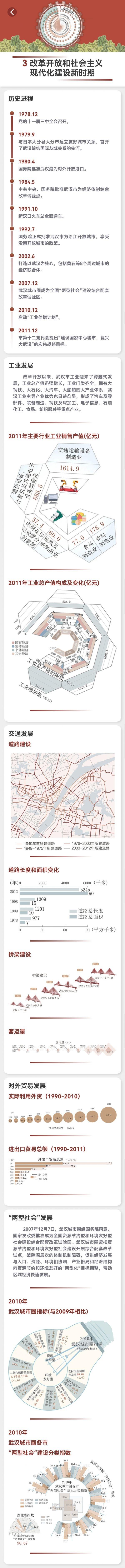 “武汉百年辉煌”采取叙事地图的设计手法,通过历史车轮的隐喻设计,以时间或空间为轴线进行内容布局,通过与专题相呼应的手绘画、照片插画、专题地图、文字介绍、各类统计图表等多种表达形式,将武汉百年发展成就组织成一个脉络清晰的叙事故事,对武汉建党百年来的发展、变化、成就进行一个阶段性的概括,充分体现党在武汉百年历史长河中的“担当”“探索”“实践”及“作为”,让读者全方位了解英雄武汉的百年蝶变和人文精神,领悟中国共产党人的初心与使命。
