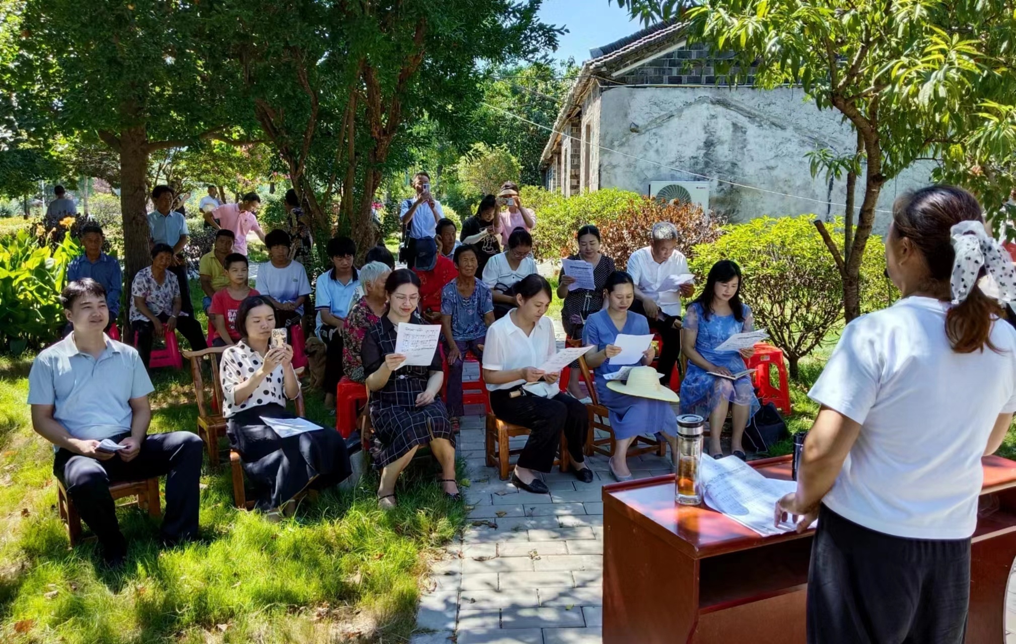 “在这里,李先念南下湖北建立了第一站敌后抗日根据地,新四军打响了湖北抗日战争第一枪,抗战胜利后全国第一支起义队伍加入了新四军第五师……”宣讲人陈海元对吴店革命历史如数家珍,精彩的宣讲引得在座听众频频点赞。广水市亮花鼓艺术团团长方立玉为大家演唱了本土红色歌曲《啊,大别山红色的山》《红色吴店赞歌》,脍炙人口的红色歌曲让听众们心情激荡,纷纷掏出手机拍照留影。