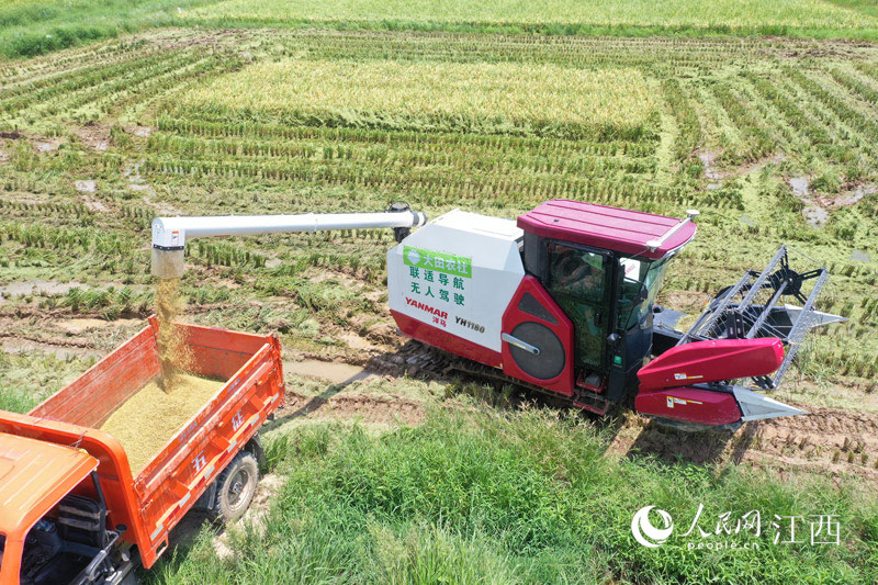在南昌县蒋巷镇,无人驾驶收割机正在稻田收割早稻。人民网 时雨摄