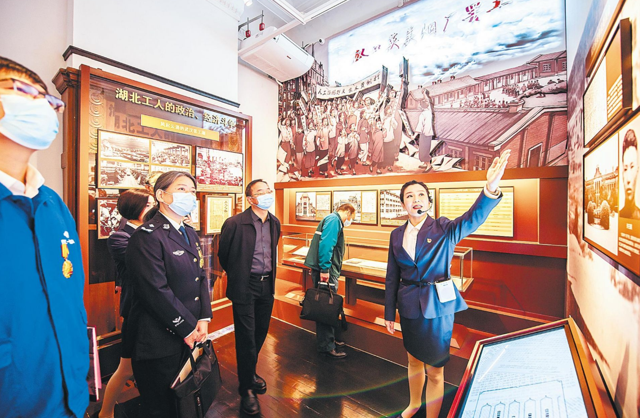 11月17日,汉口中华全国总工会旧址纪念馆开馆仪式在武汉市江岸区友益街16号举行。图为几名职工代表在讲解员带领下参观纪念馆内的展览。 (湖北日报全媒记者 朱熙勇 摄)