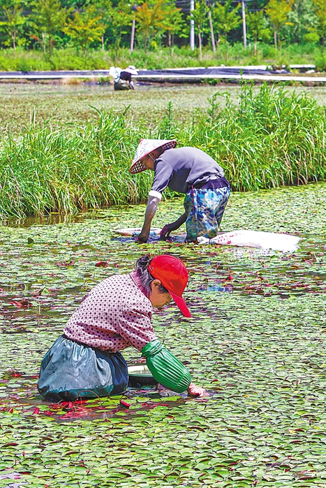 利川市凉雾乡继昌村莼菜种植基地,村民正在采收莼菜。蔡俊 摄