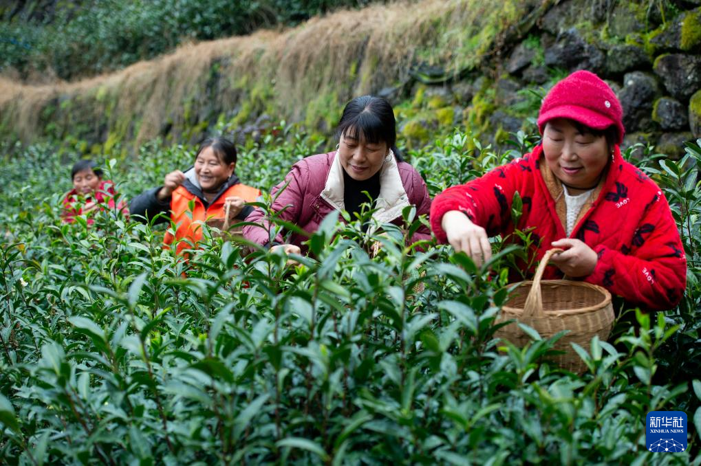 1月29日,三峡库区湖北省宜昌市秭归县“丝绵茶1号”早茶基地开园,当地茶农抢采茶叶嫩芽,供应春节市场。湖北秭归是“中国丝绵茶之乡”,近年来,当地茶农和华农大科研人员立足本地优势茶树品种,选育并推广“丝绵茶1号”特早生茶树新品种,助力乡村产业振兴。