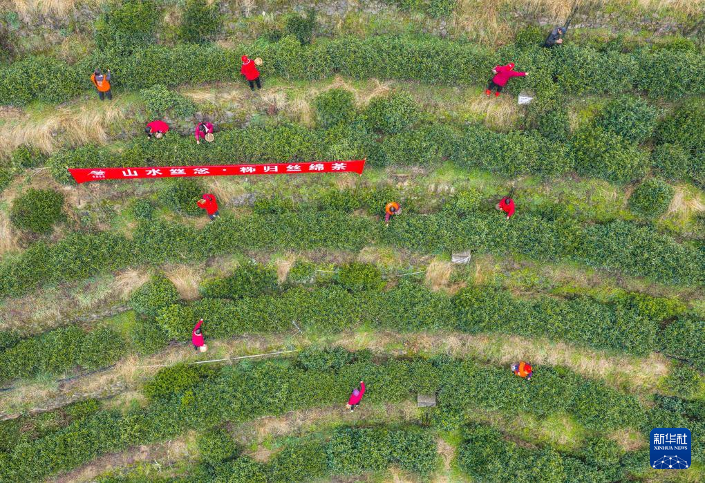 1月29日,湖北省秭归县郭家坝镇王家岭村茶农在“丝绵茶1号”茶园采摘茶叶嫩芽(无人机照片)。新华社发(王罡摄)
