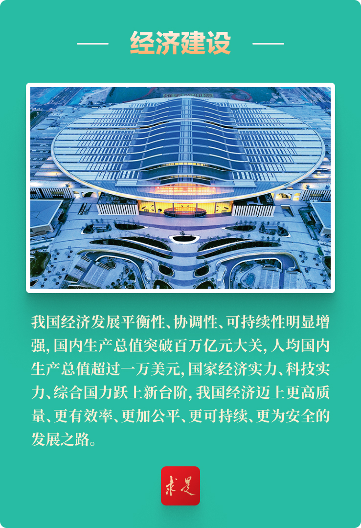 “我国经济发展平衡性、协调性、可持续性明显增强,国内生产总值突破百万亿元大关,人均国内生产总值超过一万美元,国家经济实力、科技实力、综合国力跃上新台阶,我国经济迈上更高质量、更有效率、更加公平、更可持续、更为安全的发展之路。”