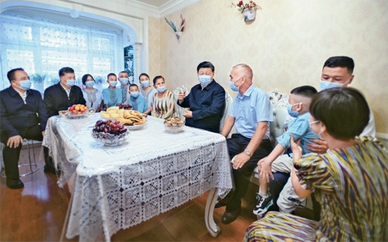 2022年7月12日至15日,中共中央总书记、国家主席、中央军委主席习近平在新疆考察。这是13日上午,习近平在乌鲁木齐市天山区固原巷社区,同维吾尔族居民阿布来提·吐尔逊一家人围坐在一起拉家常。新华社记者谢环驰摄