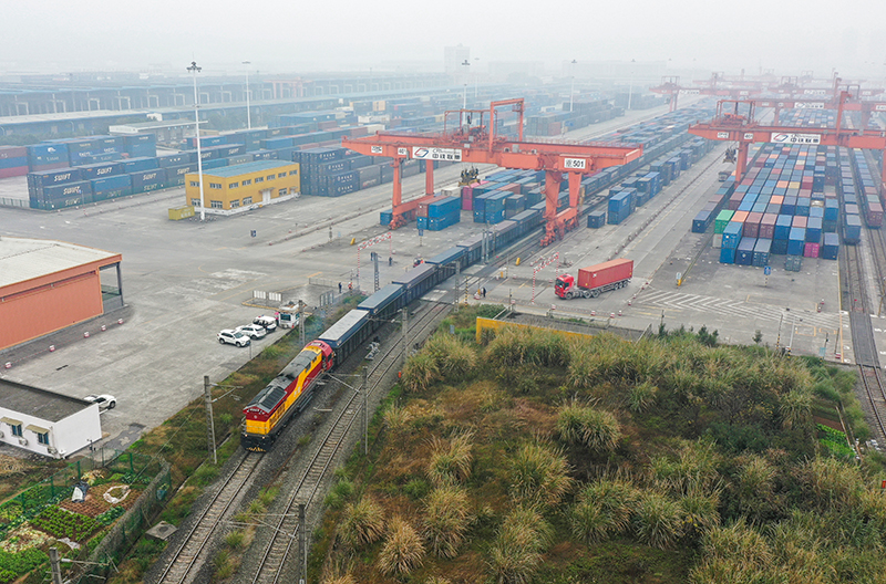 △2023年1月22日,农历新年首趟西部陆海新通道铁海联运班列从重庆团结村中心站发车(无人机照片)。