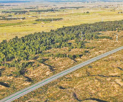 “十四五”时期,“三北”工程攻坚战取得阶段性成效。图为内蒙古库布其沙漠北缘锁边林带。新华社记者李志鹏摄